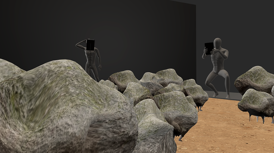 Four devices, placed on stands around a square filled with soil, act as portals to four different augmented realities occupying the same space. In each reality, surrealistic manipulated 3D renders of physical stones serve as subjects.